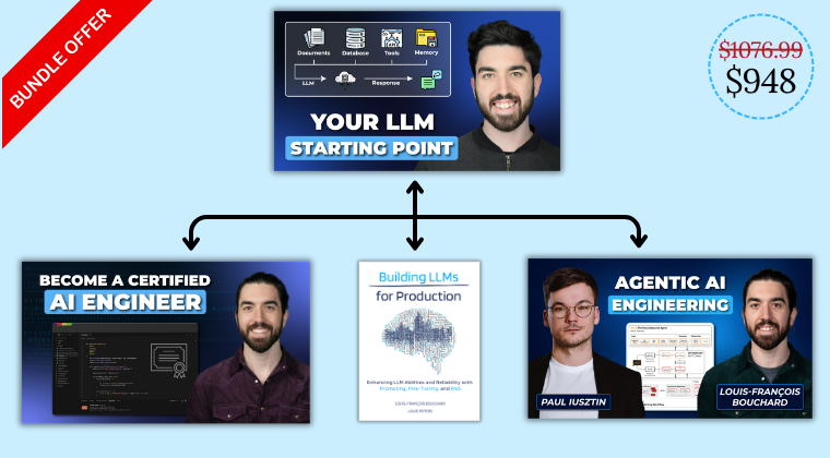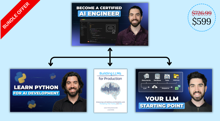 Bundle • 4 learning products(For developers) to become an expert LLM developer. Start with our 10-hour boot camp and follow up with our 60-hour beginner to advanced LLM Developer course for tons of insights, practice, guidance, and a valuable final project.
